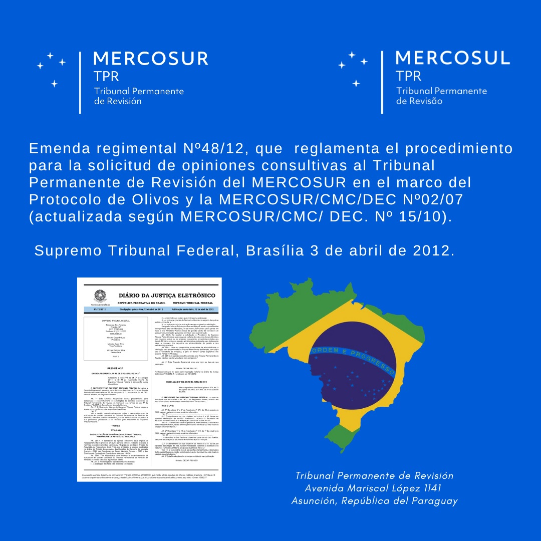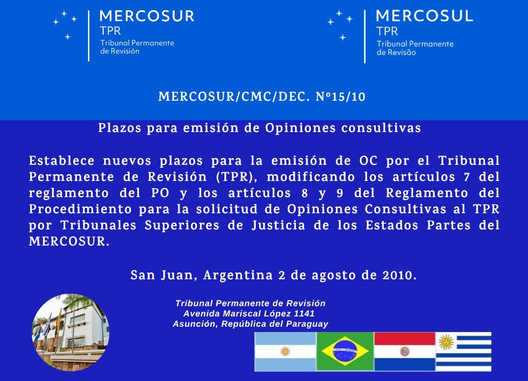 Plazos para emisión de Opiniones Consultivas La CMC/DEC Nº15/10 establece los plazos para la emisión de opiniones consultivas por el Tribunal Permanente de Revisión, modificando el artículo 7 del reglamento del Protocolo de Olivos, y los artículos 8 y 9 del reglamento del procedimiento para solicitud de Opiniones Consultivas al TPR por Tribunales Superiores de Justicia de los Estados Parte del Mercosur. San Juan, Argentina, 2 de agosto de 2010.