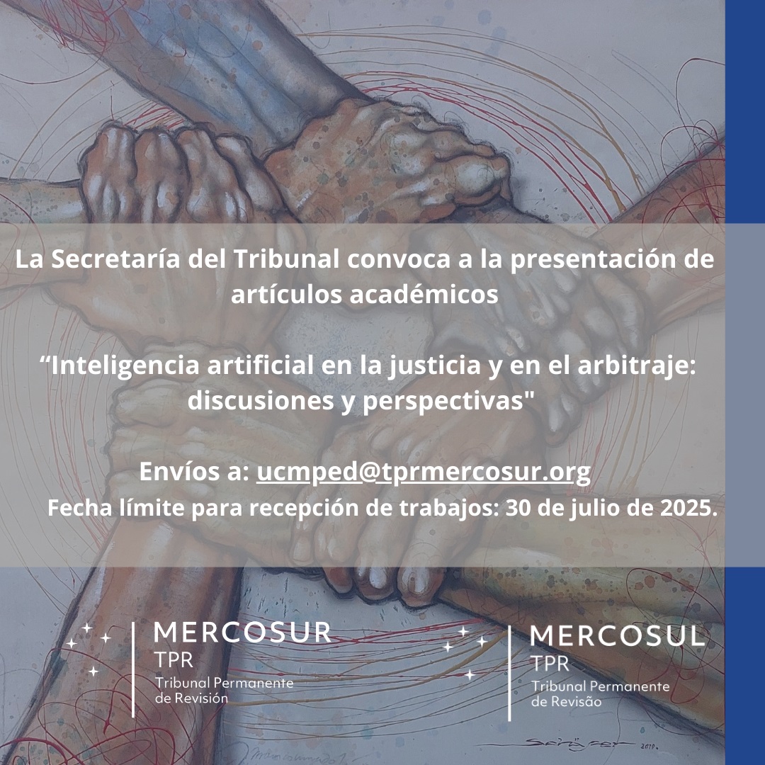 La Secretaría del TPR convoca a la presentación de articulos académicos: "Inteligencia artificial en la justicia y en el arbitraje: discusiones y perspectivas". Guía para la presentación de trabajos. Envíos a: ucmped(arroba)tprmercosur.org Fecha límite para recepción de trabajos: 30 de julio de 2025. 07/Abr/2025. |