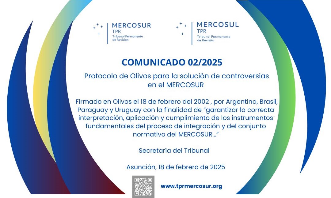 Comunicado 02/2025 El Protocolo de Olivos para la solución de controversias en el Mercosur entró en vigencia el 1 de enero de 2004, una vez concluido el cuarto depósito del instrumento de ratificación realizado por la República Federativa del Brasil el 2 de diciembre de 2003. Acceda al documento en: Protocolo_de_Olivos_es.pdf.