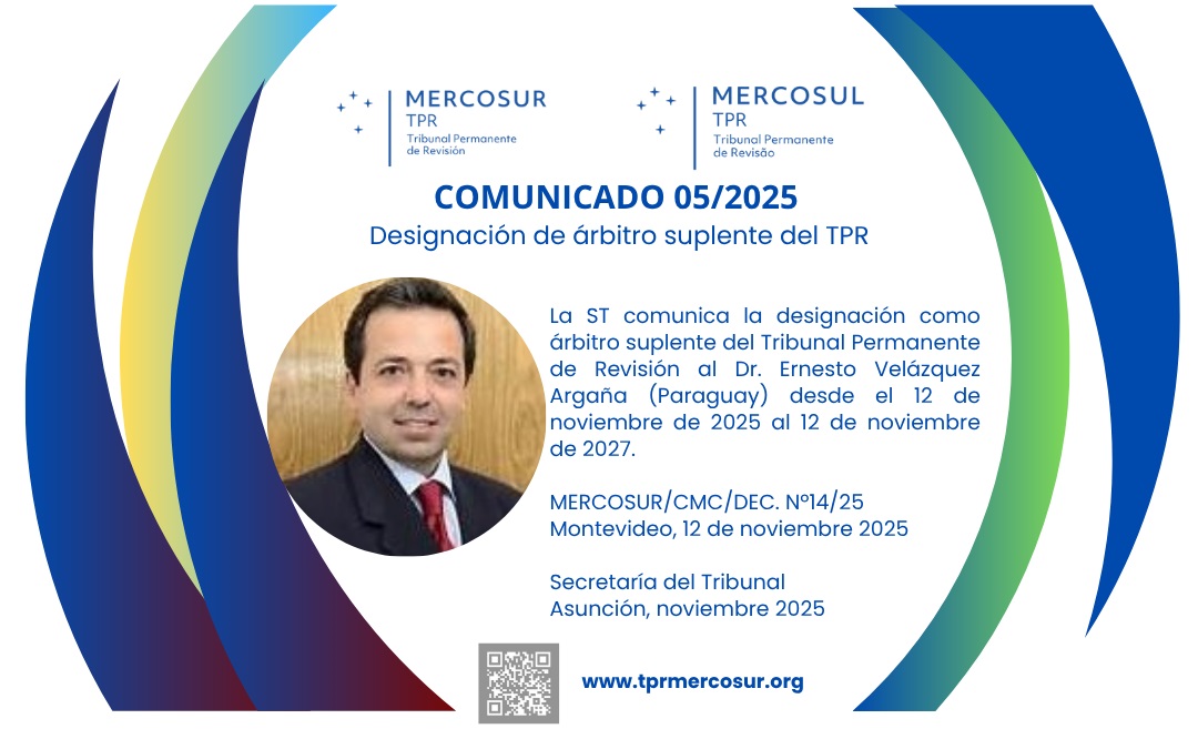 Participación del Dr. Michelson Irusta en el programa "Aires Contitucionales" El árbitro titular del Tribunal Permanente de Revisión por la República Argentina, Dr. Guillermo Michelson Irusta, realizó una participación especial en el programa "Aires Constitucionales", producido y conducido por la Abg. Claudia Marinelli. Compartimos el video transmitido por Señal Metro, Cablevisión HD y Flow Canal 9, desde la República Argentina: https://youtu.be/m7jfzpPDKSI 17/Sep/2025. |