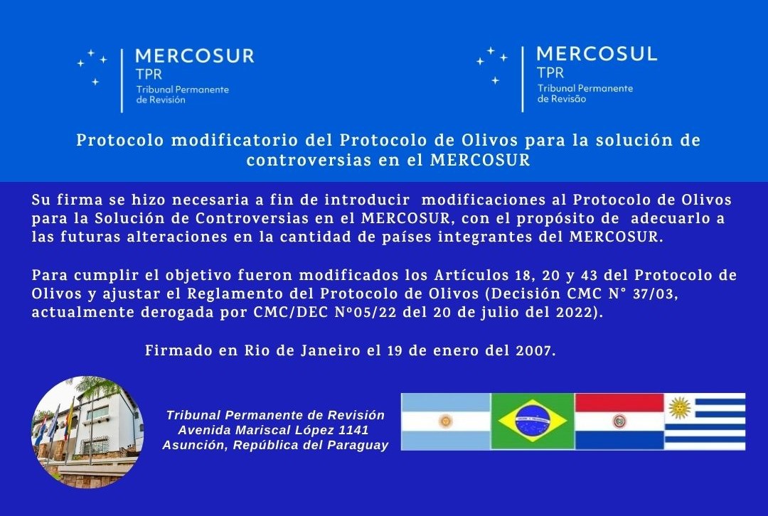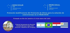 Protocolo modificatorio del Protocolo de Olivos Firmado por la República Argentina, República Federativa del Brasil, República del Paraguay y la República Oriental del Uruguay, el 19 de enero de 2007, en Rio de Janeiro. Disponible en: Protocolo_Modificatorio_de_Olivos_es.pdf. 19/Ene/2025. |