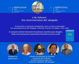 3 de febrero: Día Internacional del Abogado "El derecho se aprende estudiando, pero se ejerce pensando". Los mandamientos del abogado. Eduardo Couture (Uruguay, 1904 - 1956). Se comparte material informativo de opiniones consultivas para abogados: Material de OC para jueces y abogados.