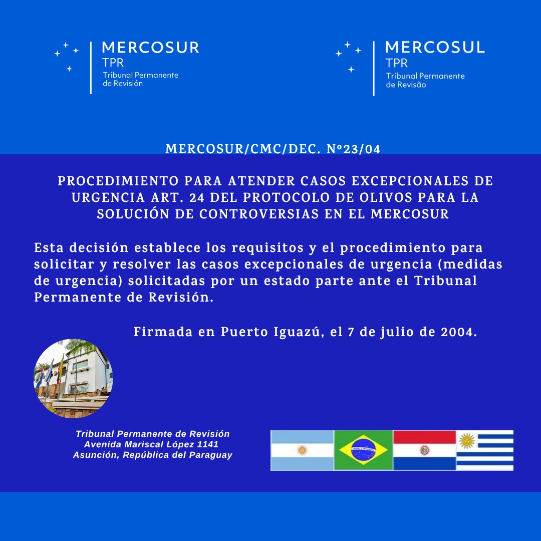 CMC/DEC Nº 23/04: Procedimiento para atender casos excepcionales de urgencia. Art. 4 del Protocolo de Olivos para la Solución de Controversias en el Mercosur. Esta decisión establece los requisitos y el procedimiento para solicitar y resolver los casos excepcionales de urgencia (medidas de urgencia) solicitadas por un Estado Parte ante el Tribunal Permanente de Revisión. Firmada en Puerto Iguazú, el 7 de julio de 2004. 07/Jul/2025. |
