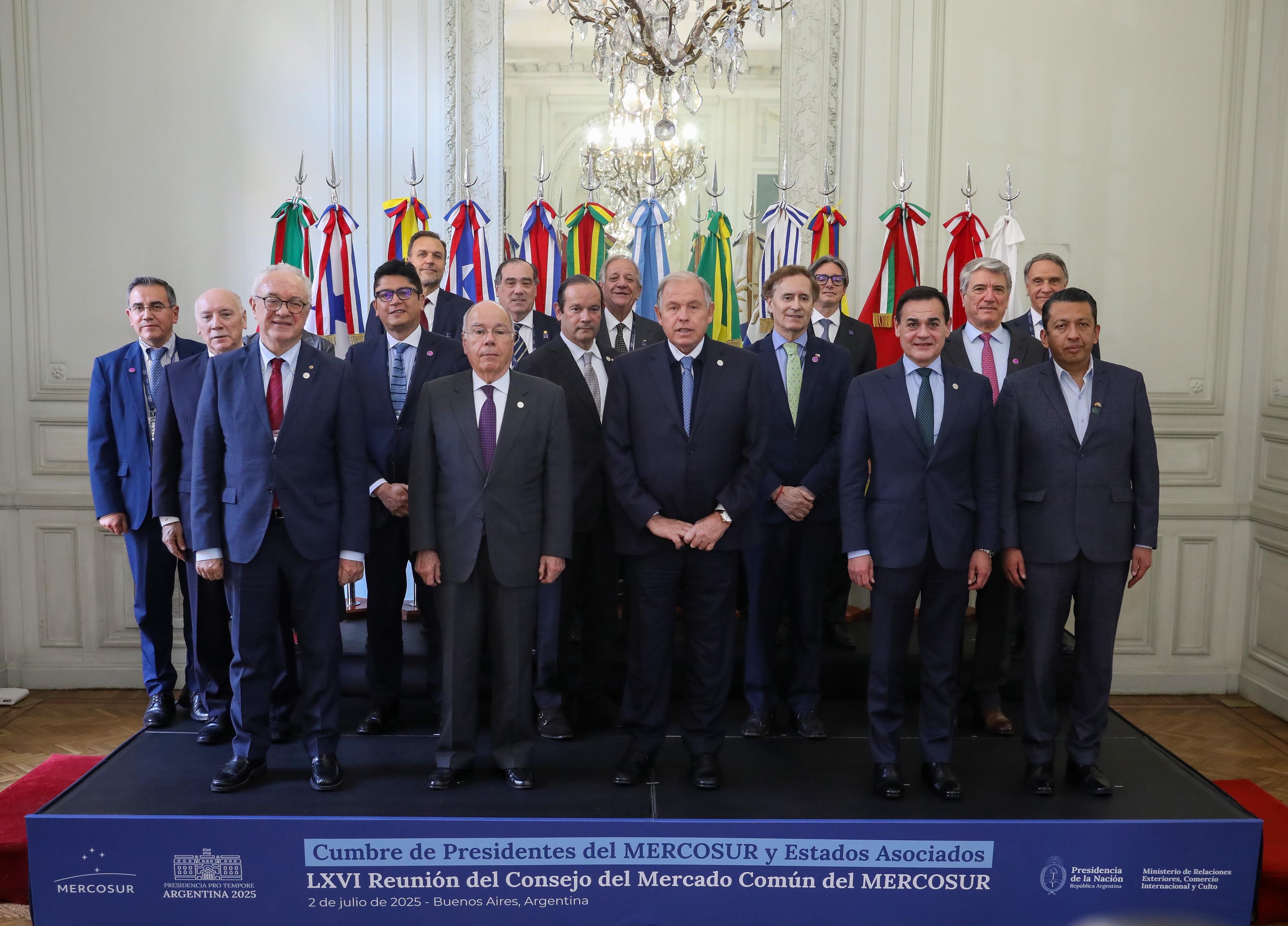 El Presidente del TPR, Emb. Eladio Loizaga, en la LXVI Reunión del Consejo de Mercado Común del Mercosur, en la ciudad de Buenos Aires, junto con los cancilleres e invitados. 02/Jul/2025. |