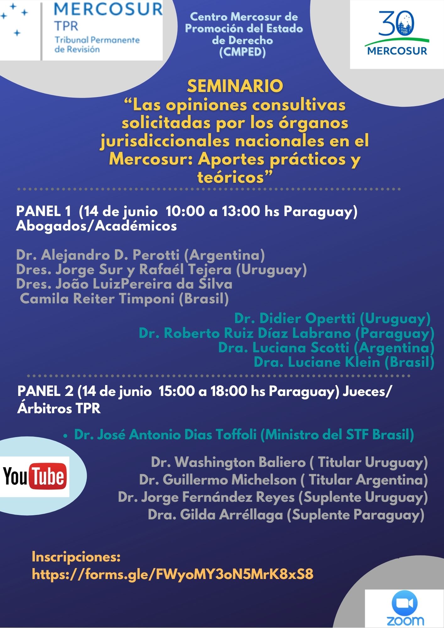 Seminário "Las opiniones consultivas solicitadas por los órganos jurisdiccionales nacionales en el Mercosur: Aportes prácticos y teóricos". Objectivo: Proceder a uma aproximação entre a teoria e a prática no que se refere à questão das opiniãos consultivas solicitados pelos tribunais nacionais, constantes do Protocolo de Olivos. Para o efeito, são chamados os operadores jurídicos que tiveram oportunidade de introduzir uma OC, bem como de deliberar sobre o envio do mesmo ao TPR, e o seu posterior cumprimento ou não. Da mesma forma, especialistas na disciplina são convidados a contribuir com sua perspectiva teórica sobre o assunto. Transmitido no Youtube: Panel 1 em https://www.youtube.com/watch?v=cgMlnnkA_UM Panel 2 em https://www.youtube.com/watch?v=VM6EMCvw3EU 14/Jun/2021. |