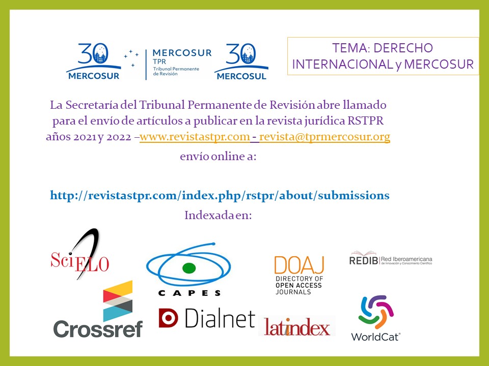 A Secretaria do Tribunal Permanente de Revisão abre chamada para a submissão de artigos a serem publicados na revista jurídica RSTPR, anos 2021 e 2022. Tema: Direito Internacional e Mercosul. Envio online em: http://revistastpr.com/index.php/rstpr/about/submissions. 16/Jun/2021. |